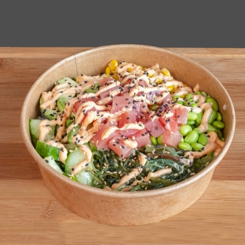 Tuna , komkommer , avocado , edammebonen , mais , wakame , sesam , saus : Wasabi , spicey , mayo