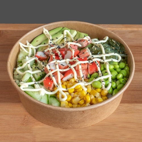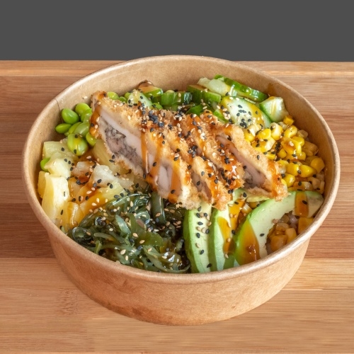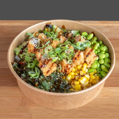 Gefrituurde kip , komkommer , mais, avocado, edammebonen , ananas .sesam saus : yakitori