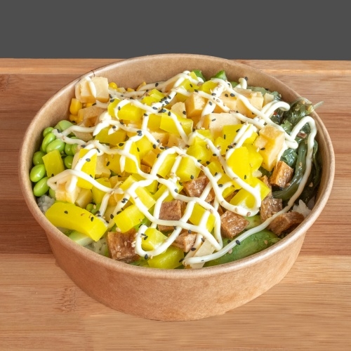 Tofu, avocado , komkommer , mais , edammebonen , tomago , osinko , sesam , saus : Japanse mayo