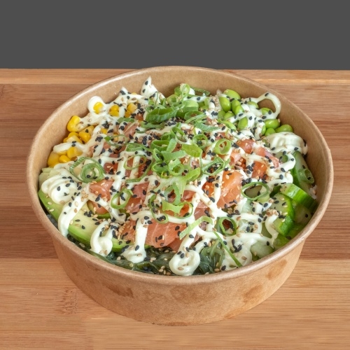 Zalm , komkommer , avocado , edammebonen , mais , wakame , lente-ui , sesam , saus : wasabi , spicey , mayo.